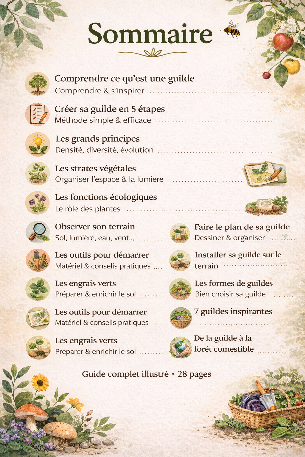 À travers une approche claire, progressive et illustrée, ce e-book vous accompagne pas à pas pour comprendre ce qu’est une guilde, choisir les bonnes plantes, observer votre terrain, dessiner votre plan et passer à la plantation avec plus de confiance.