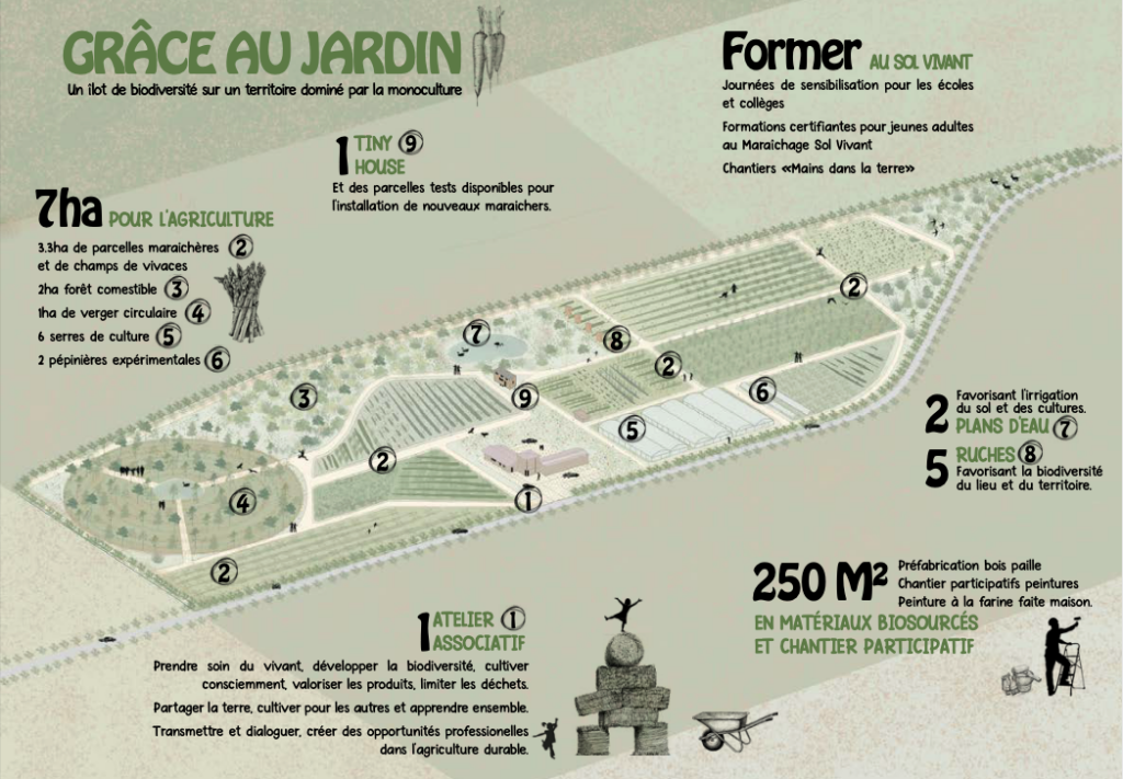 Jean-Marie Lioult, à l’origine du projet Grâce au jardin, nous décrit les différents projets qui seront mis en œuvre sur le site de 7 hectares à Tremblay-les-Villages : un jardin expérimental comprenant une forêt comestible et un verger circulaire, un chantier d’insertion porté par l’association Grâces, un espace-test pour lancer de jeunes maraîchers, et deux jardins de proximité portés par les Restos du Cœur et le GIP Relais Logement.