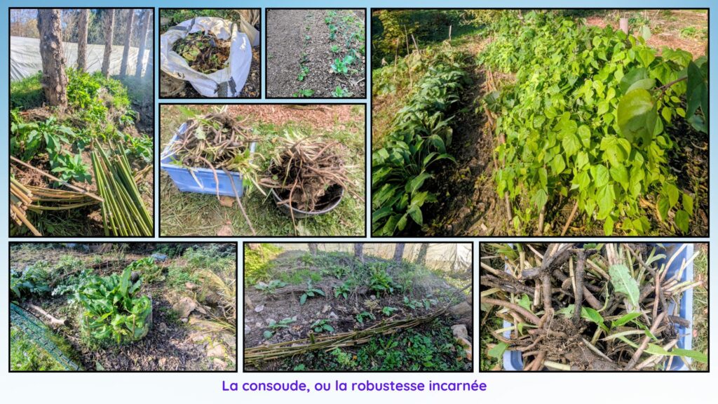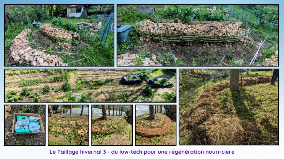 Des arbres fruitiers, baies et arbustes produisent déjà des fruits. Sol couvert, à près de 100 %, sous la canopée (comestibles, fourragères et médicinales).